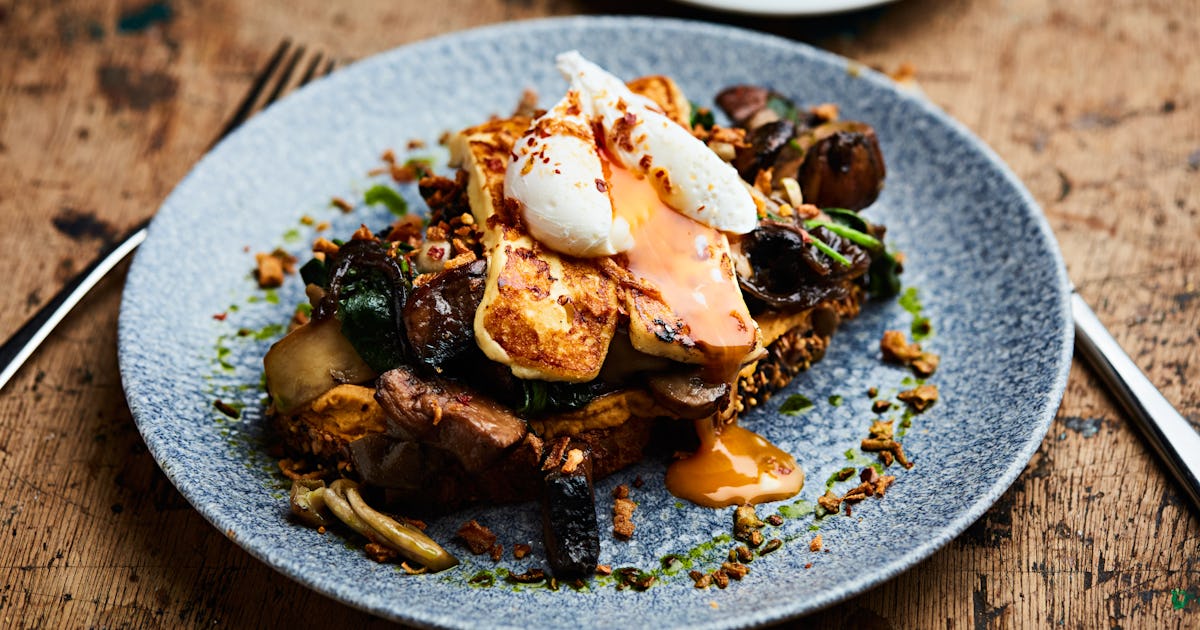 Roast Portobello & wild mushrooms with caramelised onions & spinach, grilled halloumi, white bean & sun blushed tomato hummus, poached egg and crispy shallots on sourdough toast